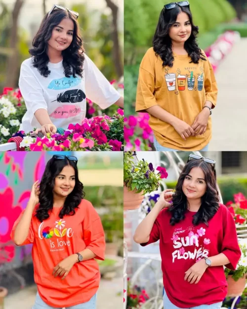 ৪ পিস টি-শার্ট কম্বো মাএ ৯৯৯ টাকা (Leaf off white/Love Coral/Sunflower merun/Happy Love Biskut)